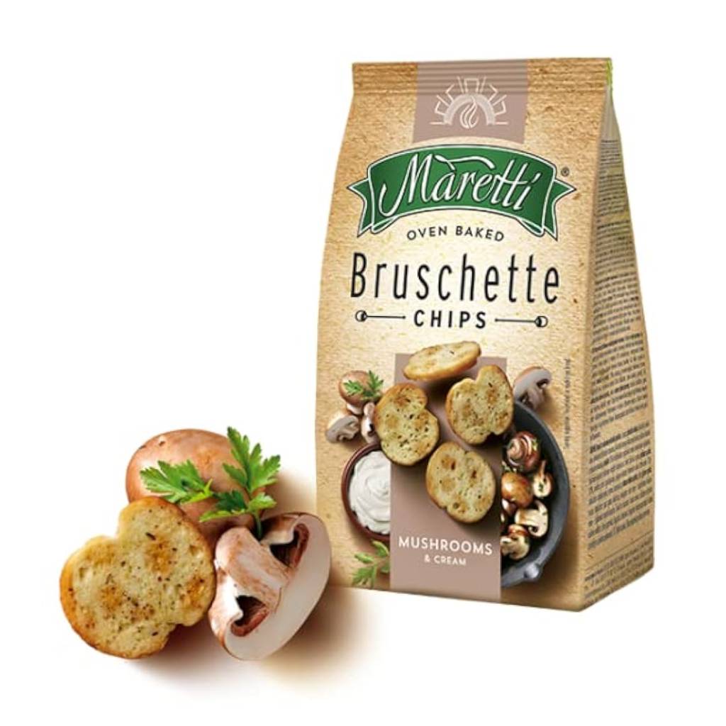Bruschette Maretti Mushrooms N Cream – Τραγανές φέτες διπλοφουρνισμένου ψωμιού με λαχταριστό συνδυασμό μανιταριών και κρεμώδους γεύσης. Ιδανικό σνακ χωρίς τεχνητά χρώματα ή συντηρητικά, κατάλληλο για χορτοφάγους. Απόλαυση σε κάθε μπουκιά!
