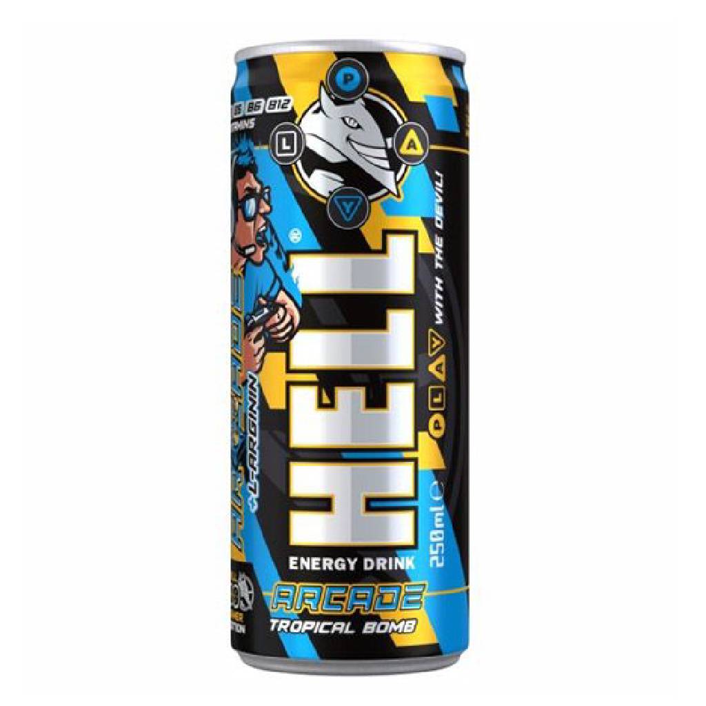 Χαρίστε στον εαυτό σας μια δόση ενέργειας για διασκέδαση με φίλους με τα δυναμωτικά ροφήματα Hell Gamer Arcade Tropical Energy Drink, ποσότητας 250 ml, με μείγμα βιταμινών.