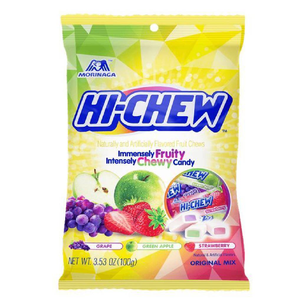 Το Hi-Chew είναι ένα ιαπωνικό αγαπημένο προϊόν, χωρίς γλουτένη. Αυτά τα ξεχωριστά τυλιγμένα μικρά καλούδια έχουν εκπληκτική υφή. Κάπου ανάμεσα σε μάσημα και τσίχλα. Φτιαγμένο με αληθινά φρούτα για αυθεντική γεύση. Μασήματα με γεύση φράουλα, σταφύλι και μήλο (καθαρό βάρος: 100g)