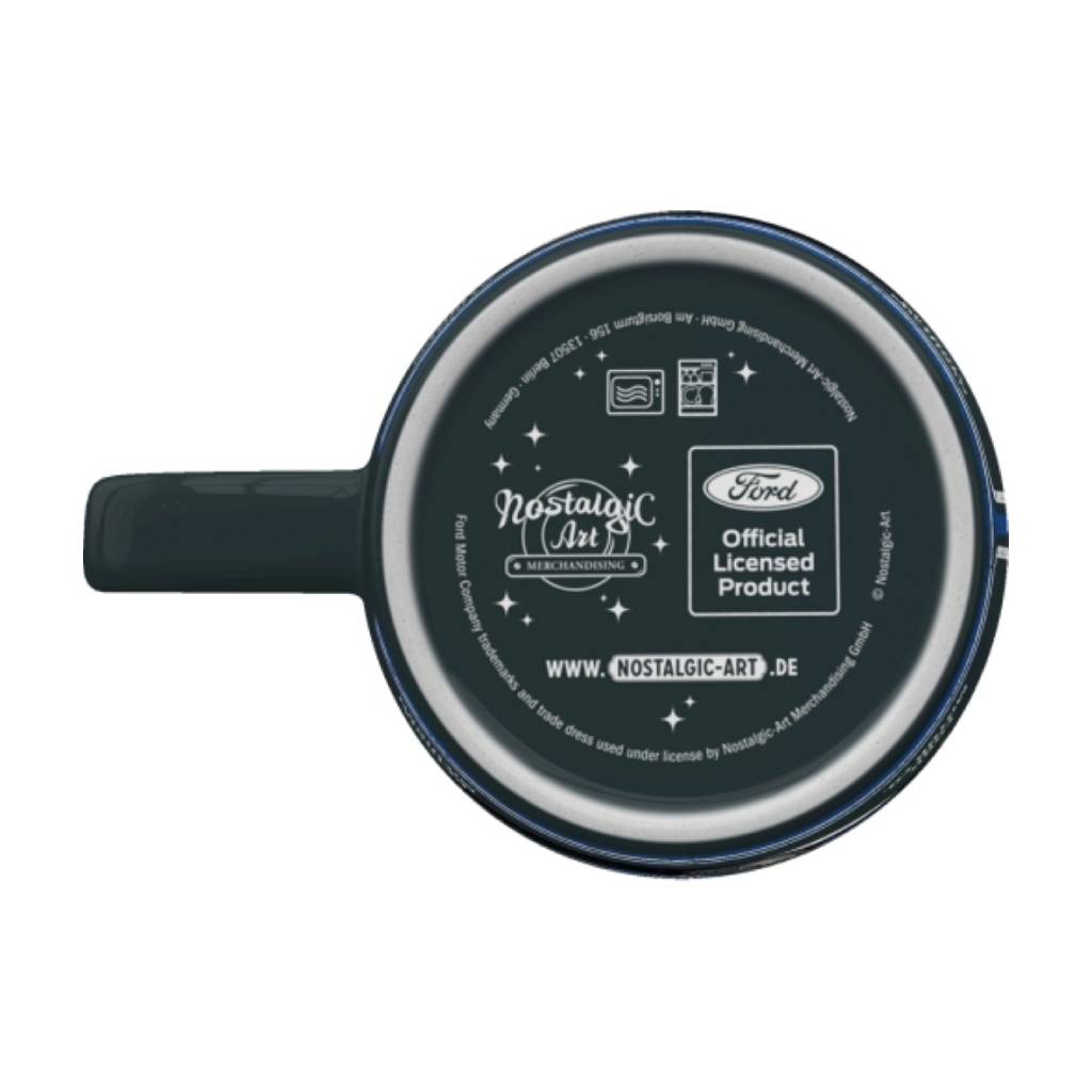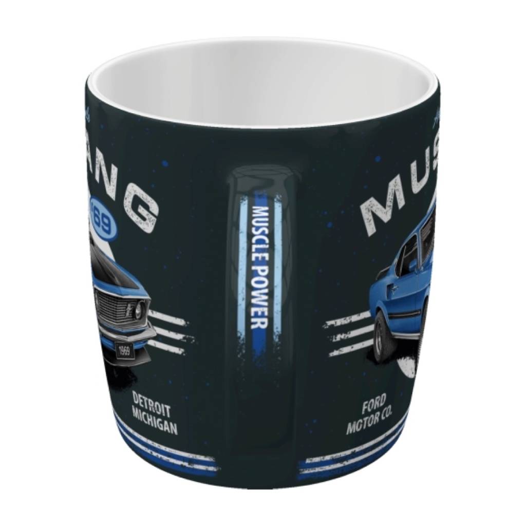 Κεραμική κούπα με retro σχέδιο του θρυλικού Ford Mustang Mach 1 του 1969 σε μπλε χρώμα. Με χωρητικότητα 330 ml και διαστάσεις 8,5 x 9 cm, αποτελεί ιδανικό δώρο για λάτρεις των κλασικών αυτοκινήτων και συλλέκτες vintage αντικειμένων.