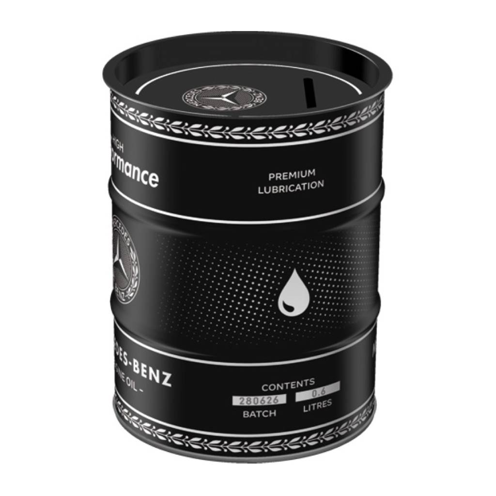 Συλλεκτικός μεταλλικός κουμπαράς με το vintage σχέδιο Engine Oil της Mercedes-Benz. Ένα πρακτικό και διακοσμητικό αξεσουάρ που συνδυάζει retro αισθητική και κλασικό αυτοκινητιστικό στυλ.